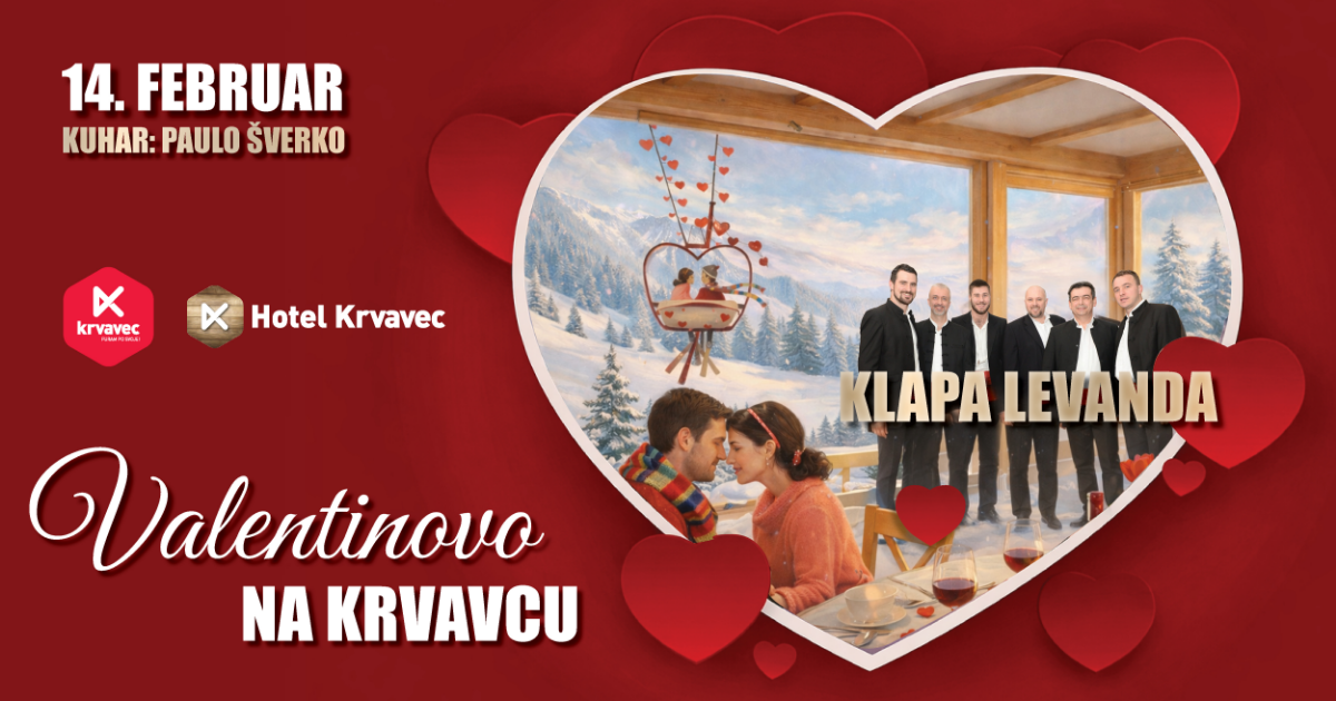 Naj bo vajin večer nekaj posebnega, v Hotelu Krvavec. Razvajali vaju bomo z 4-hodnim menijem izpod rok kulinaričnega mojstra Paula Šverka in dalmatinskimi melodijami Klape Levanda.